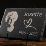 Aujourd’hui, chaque plaque funéraire que je réalise est unique. Je travaille avec des matières naturelles, comme l’ardoise, que je grave dans mon atelier, avec soin et respect.